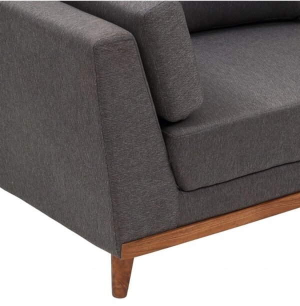 Material: It features a grey fabric upholstery and a solid wood structure, with a visible wooden strip incorporated into the design at the base. The fabric is noted for not conducting heat, making it suitable for humid areas, and the solid wood structure is kiln-dried and chemically tested for durability.