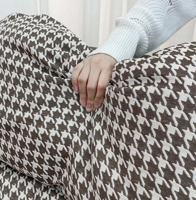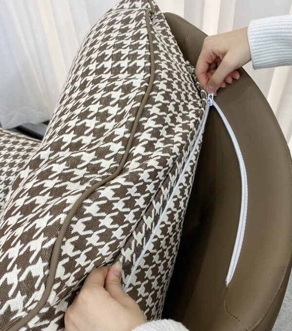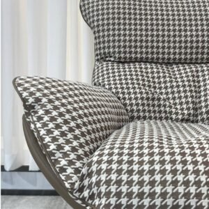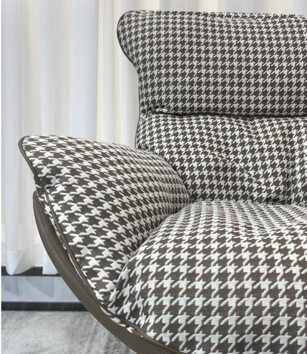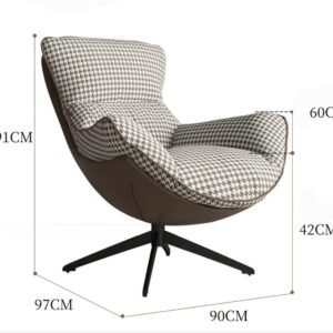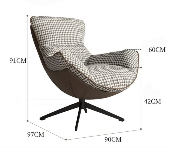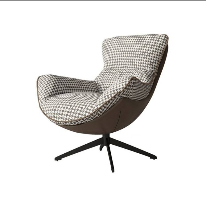 The chair has a houndstooth pattern fabric on the seat and backrest, with a brown leather base. The chair is supported by a black metal swivel base. It appears to be a comfortable and stylish piece of furniture.