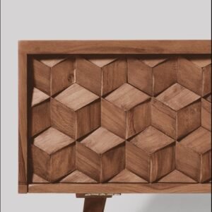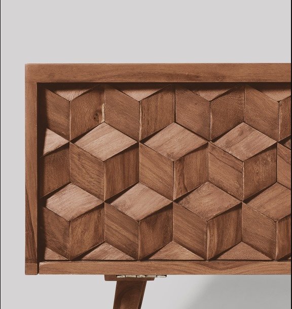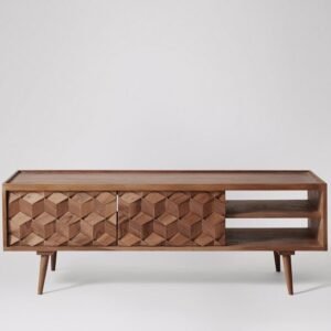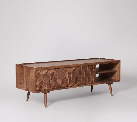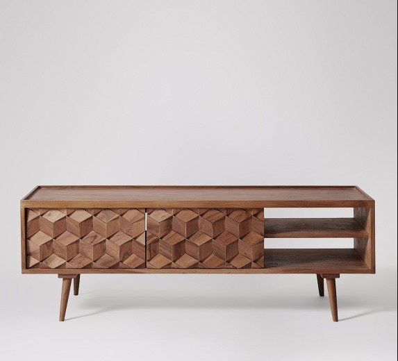 Location : Pair this bestselling wooden TV stand with a geometric rug, to echo the hypnotic tessellation on its front. A media storage unit with a twist, it doesn’t need anything else – except maybe your TV.