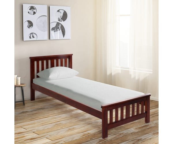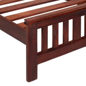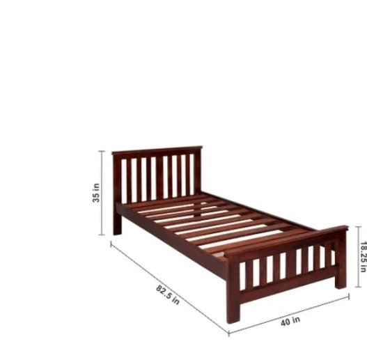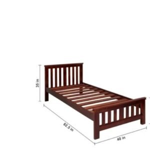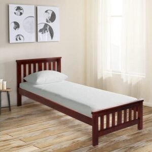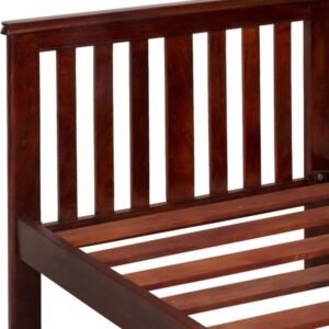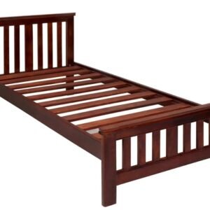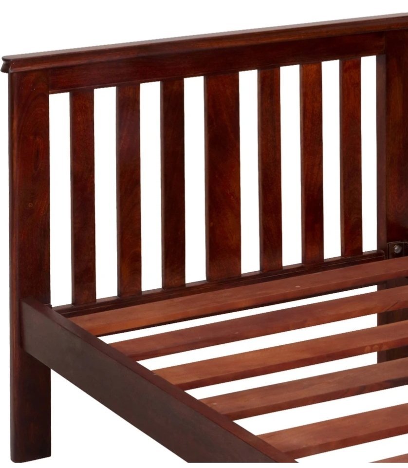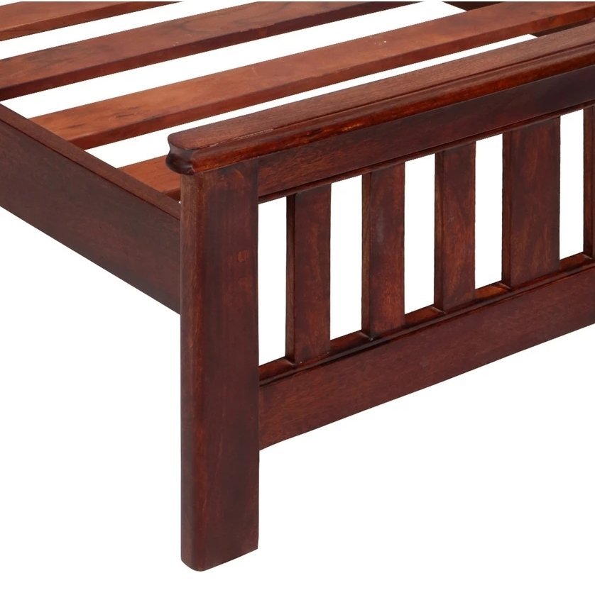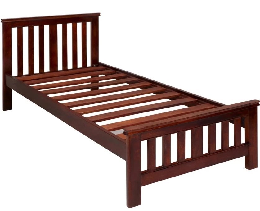 The bed in the image is a single bed made of solid wood, acacia wood. It features a simple, elegant design with a slatted headboard and footboard. The bed is finished in a rich honey tone, and it appears to be a sturdy and durable piece of furniture.